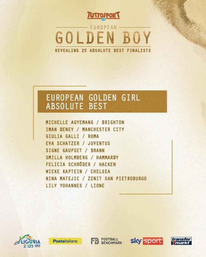 《都灵体育》公布了2025年女足金童奖的10名候选人。布莱顿女足的阿吉芒和切尔西女足的卡普坦是候选人。女足金童奖将从2022年起由《都灵体育报》颁发,上榜球员必须是在欧洲顶级联赛效力的U21球员。该奖项不能多次获奖。前三届女足金童奖得主分别是品牌琳达·凯塞多(Linda Caicedo)和维基·洛佩兹(Vicki Lopez)。女足金童奖10名候选者阿吉芒(布莱顿女足)贝内(曼城女足)朱莉娅·加利(罗马女足)伊娃·谢尔泽(尤文图斯女足)戈普塞特(布兰女足)斯米拉·霍姆伯格(哈马比女足)施里德(哈根女足)队长(切尔西)女足马特季奇(泽尼特女足)莉莉·约翰内斯(里昂女足)值得 值得一提的是,在今年的金球奖颁奖典礼上,首次颁发了女足杯奖。维基·洛佩兹 鳍艾莉获奖了。另一位前金童奖获得者琳达·凯塞多也是候选人。另外三位候选人阿吉芒和卡普坦也是今年金童奖的候选人。另一位克劳迪娅·马丁内斯不符合女足金童奖为欧洲顶级俱乐部效力的条件。 【咪咕独家看英超】