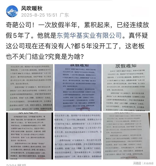 8月26日,网民打破了这个消息是一家奇怪的公司!休假半年已经累积了,它已经连续五年度假了。他是Dongguan Huaji Industrial Co.,Ltd。我真的怀疑今天该公司是否仍然有人?它已经有5年没有开始建设,老板还没有关闭,业务已经结束。为什么?这是怎么回事?让我们看一下这个网民提供的信息。这是6个假期通知中的最新通知。假期通知整个工厂都是原始的,直到2025年8月底。我希望该建筑可以正常开始,但是由于客户未订购,这已经改变了。根据事实,工厂别无选择,只能继续度假。假期将于9月1日至3月底暂时结束。在假期期间,我们希望员工将注意安全,遵守相关法律和法规,并严格禁止O您的工厂员工从未经许可就进入其他公司工作。如果与事实上的制造或合同协议有关系,则违规者将对后果负责。在假期期间,我们的工厂将履行继续为员工购买公司退休金保险的责任和义务(以确保员工可以在退休时期获得养老金),并每月支付基本的生活费用。我们希望员工能够理解,支持和合作工厂决策并克服困难。此外,如果有新的订单,ITHE公司将尽早知道一切都可以回去工作,并希望每个人都一起工作。我们希望每个人都会在假期通知期间互相告诉,以防止员工返回工厂并浪费时间和金钱。 Dongguan Huaji Industrial Co,Ltd,2025年8月25日,根据上述内容判断为因为该公司没有订单,因此被迫继续假期。它将从明年9月1日至3月1日持续整整六个月。在假期期间,员工将正常支付社会保障并获得最低限度的生活方式安全。令人惊讶的是,这不是该工厂继续假期的第一次。根据网民提供的信息,其他五个假期通知可以在2021年2月1日进行监控。尽管这是通知,穆拉内容,但它将继续在最后一个假期。换句话说,实际上,工厂至少从2020年8月开始开始假期。从现在开始,假期延续的通知将每六个月发布一次。关于这一点,一些网民评论说,主要的生活费用可以在一个漫长的假期中支付。这些公司是一百万。许多老板在假期减少了一天的钱,但他们没有一分钱。一些网民认为,一家完全充满活力的公司siastic并帮助购买社会保障和生活成本,他们不早退休吗?根据公共信息,Dongguan Huaji Industrial Co,Ltd成立于2014年3月。这是一家由香港资助的业务,注册了9.11亿港元,位于东圭恩(Changping)。说话制造商并出售装饰盒。法律代表是Yin Youji。据了解,这是一家古老的制造制造商,其产品涵盖了许多领域,例如硬件,塑料和建筑材料,并在国内外市场出售。但是,从流行病开始时,很长一段时间都没有客户,公司面临着巨大的运营压力,只能通过假期来减轻。不可否认的是,近年来,全球经济拒绝,懒惰的消费和需求对中国制造业产生了重大影响。作为在东圭的重要制造业务,Huaji Industrial SitUation还反映了一些传统的业务制造业制造业。在加强与全球市场的竞争和持续的技术进步时,东圭的制造业也正面临着迫切需要变革和升级的需求。同时,东南亚国家制造制造业的趋势变得越来越明显,这进一步增加了一些制造公司的生存。 Huaji工业假期上的通知可能只是这种背景下传统制造业困境的缩影。对于该公司的员工,尽管许多网民认为这是一家热情的公司,但该公司已经度假了很长时间,并且不允许员工找到工作。这种做法值得讨论。至少5年后。仅依靠生活成本的成年人如何支持家庭的收入?我无法想象这家公司剩下一些员工。如果员工真的不保护Their权利,建议员工独立团结。您如何看待它?